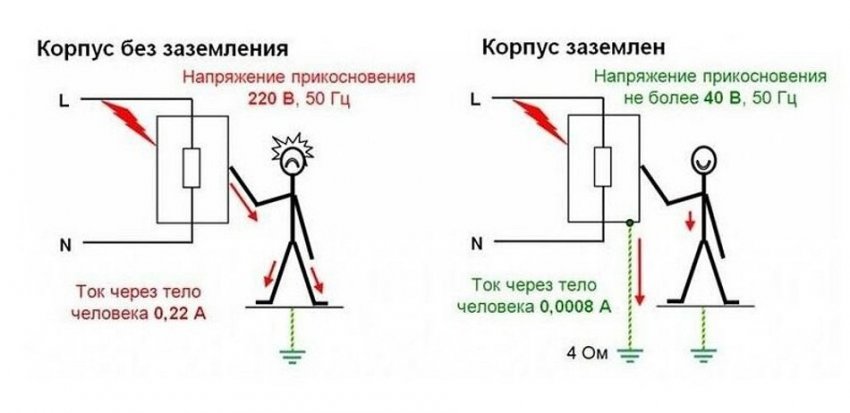 Предположим к розетке, не имеющей заземления, подключена стиральная машинка. При повреждении кабеля с большой вероятностью корпус машинки будет находиться под напряжением. Если человек прикоснется к корпусу, то его ударит током. Прохождение тока длительное время может нанести серьезные травмы или даже привести к летальному исходу.