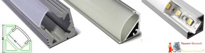 Монтируются под потолком в углах, на нижней панели кухонных шкафов или в самих шкафах и шкафчиках. Проводку в них не прокладывают, потому организация внутреннего пространства совсем иная — делают площадку на которую удобно крепить ленту из светодиодов. Ее положение выбирают исходя из необходимого направления светового потока.