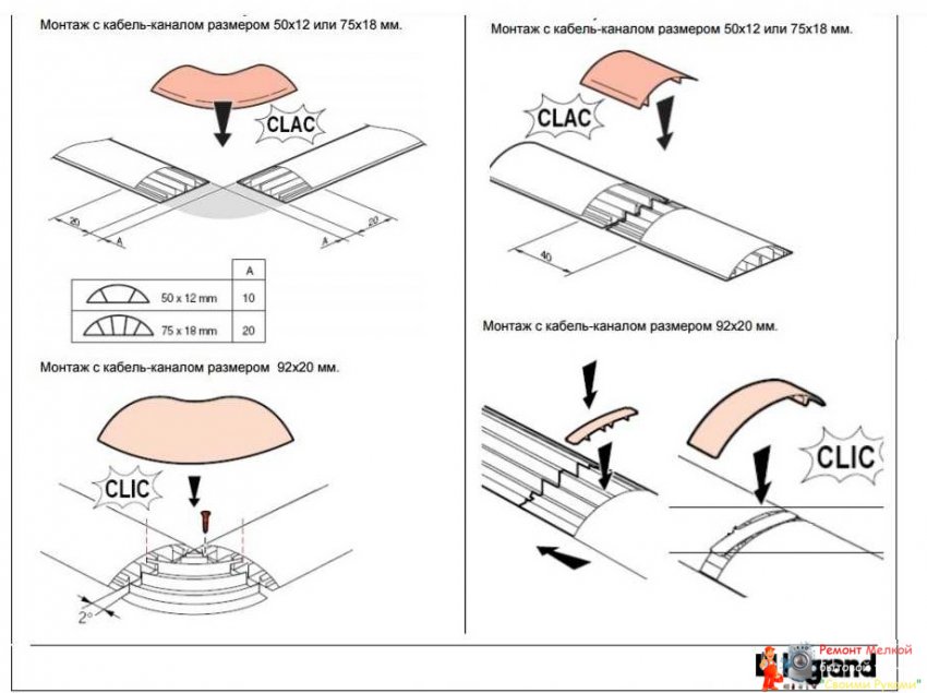 Цветовая гамма не отличается разнообразием: обычно есть серый, белый и черный. Стыки двух полос, углы и повороты можно оформить при помощи фасонных изделий подходящего размера. Сначала монтируются нижняя часть, укладываются проводники, после чего защелкивается крышка.