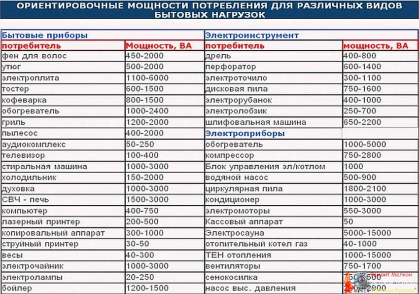 Таблица потребляемой мощности различных электроприборов