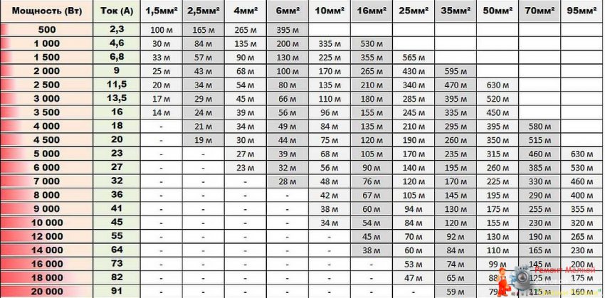 Таблица определения сечения кабеля по мощности и длине
