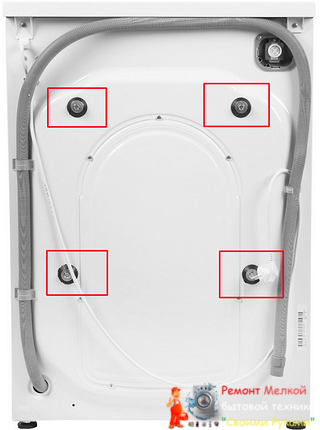 Если всё в порядке, дальше снимаем упаковку и транспортировочные болты. Это важно сделать очень внимательно, так как если забыть снять хотя бы один и запустить стирку — можно сильно повредить механизм. Порядок снятия всех таких деталей расписан в правилах эксплуатации стиральной машины. У разных моделей он может отличаться.