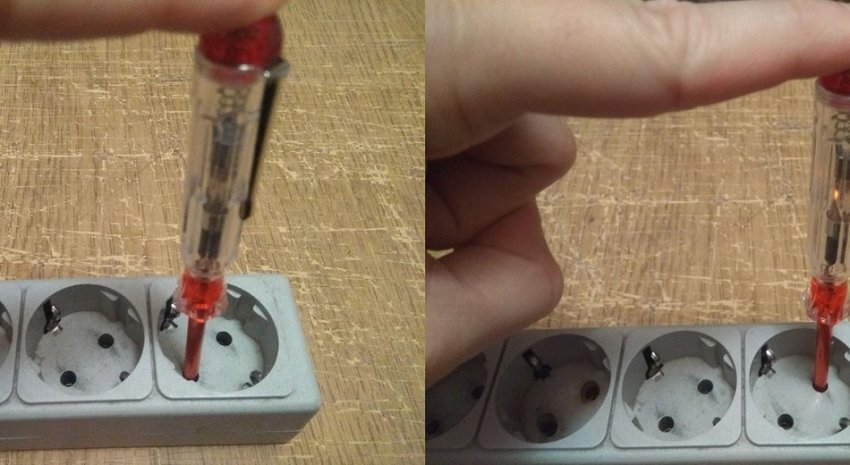 - Также можно не зажимать пальцами щуп, а прикоснуться им к стене рядом с розеткой или к заземленной металлической поверхности.