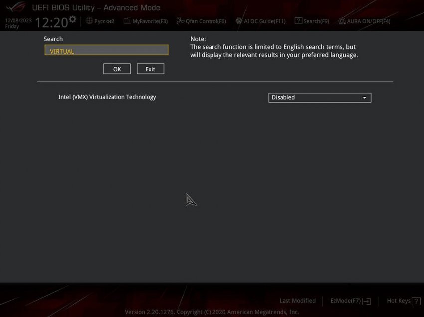 Впрочем, вам совсем не обязательно судорожно листать БИОС, ища нужные параметры в настройках. Достаточно нажать кнопку F9 или вручную открыть меню поиска, после чего ввести туда слово «Virtualization», ну а затем включить или при необходимости отключить эту функцию.