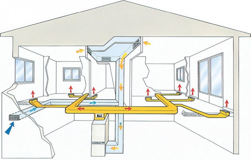 Довольно редкий тип, поскольку он сложен в исполнении и имеет массу недостатков. По сути он чем-то напоминает водяное отопление, только вместо разводки труб в помещения проложены воздуховоды. По одним из них теплый воздух подается в комнаты, по другим уже охладившийся уходит обратно. Можно сказать, это большой тепловентилятор с циркуляцией воздуха по кругу.