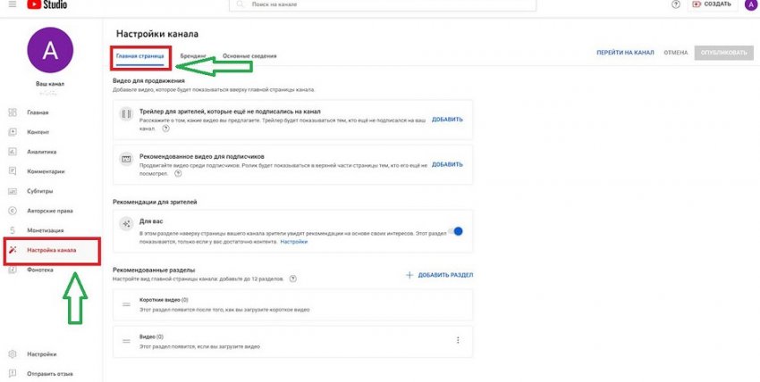 - Остаемся все там же, в «Настройках канала», но кликаем по разделу «Главная страница».