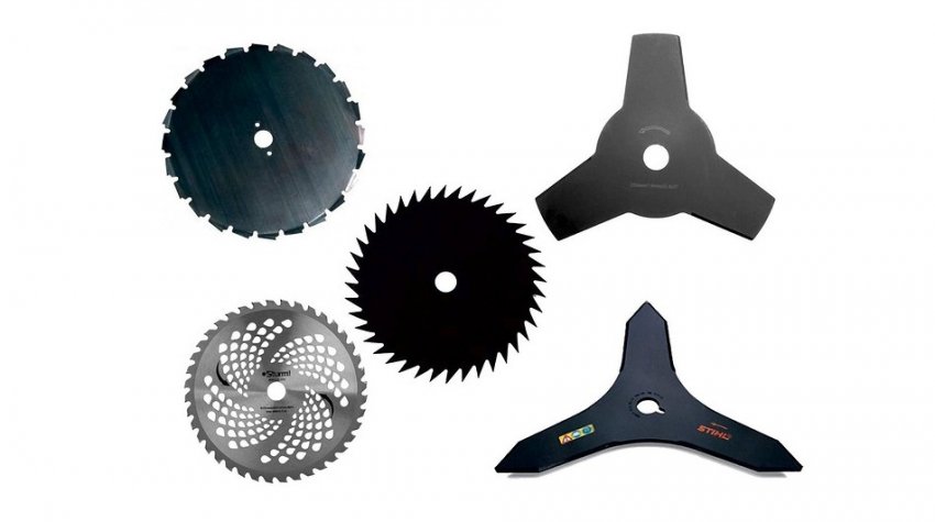 Также для покоса может использоваться диск. Обычно это цельнометаллический круг, похожий на диск для болгарки. Бывают полностью круглые модели, с насечками, зубцами или версии с лопастями. Последние еще называют ножами для триммера.