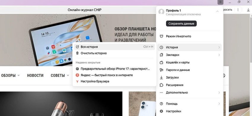 - Перейдите в раздел контекстного меню История -> Вся история.
