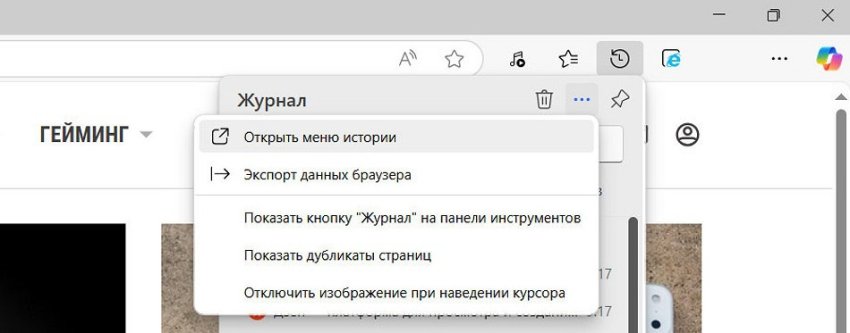 - В появившемся контекстном меню выберите «Открыть меню истории».
