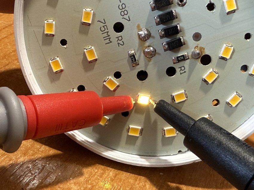 Если свечения нет, то можно ориентироваться на показатель падения напряжения. Нормальное значение составляет около 1,8–2,2 В для красных, желтых и оранжевых светодиодов, а также до 3,6 В для белых, синих и зеленых светодиодов.