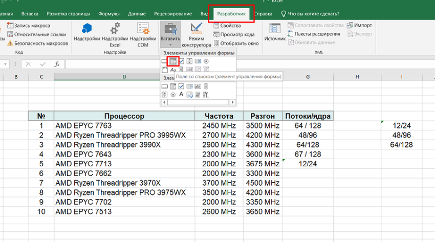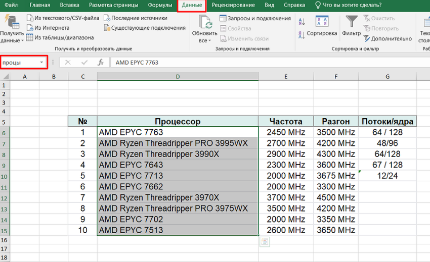 Существует еще один способ как вставить в Эксель выпадающий список — указания диапазона, который будет применяться для создания выпадающего списка. Для этого можно выделить перечень значений (например названий процессоров) и на вкладке «Данные» в крайней форме слева дать им свое название.