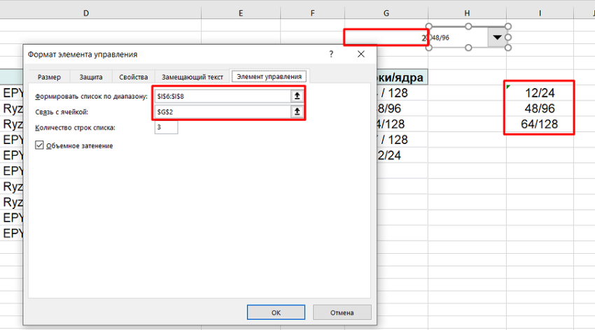 3. Кликнуть по любому месту таблицы. После того как там появится нужное поле, открыть его контекстное меню и выбрать «Формат объекта». Здесь следует указать связь с ячейкой, в которой будет находиться номер значения в списке (48/96 — второй, поэтому в ячейке G2 находится «2»). А еще — диапазон, откуда берутся данные.