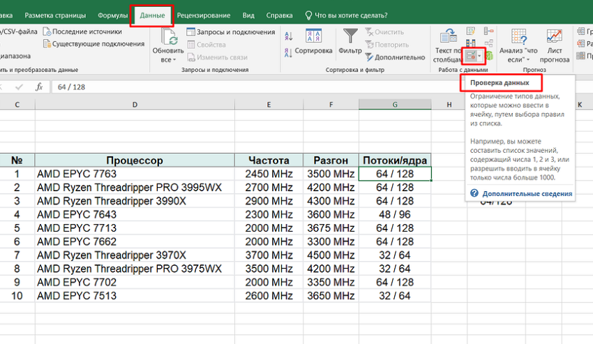 4. Найти и выбрать функцию «Проверка данных».