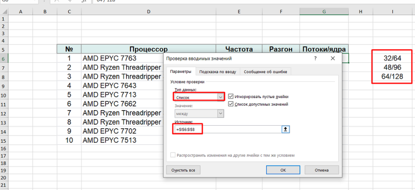 Теперь при создании ячейки с выпадающими значениями можно выбирать в качестве источника не диапазоны, а их названия. Например, указать здесь «=процы» (название действует только для определенного листа или книги Excel), можно получить список процессоров.
