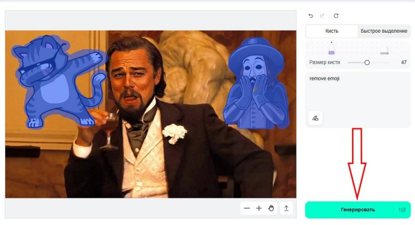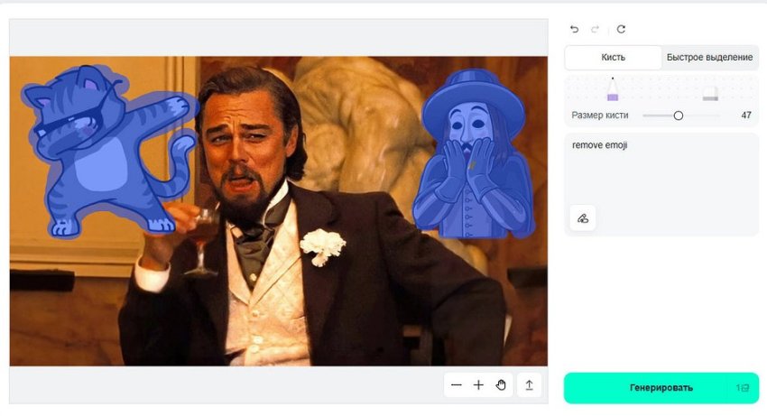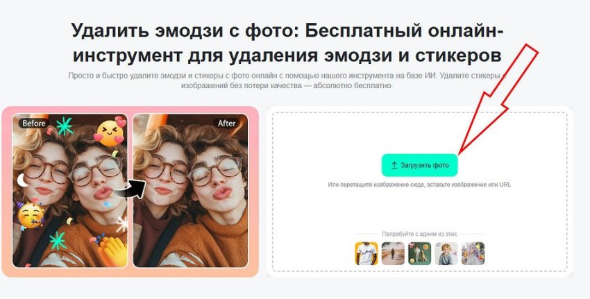 Жмем «Загрузить фото» и выбираем нашу картинку с нежелательными наклейками.- Управление производится вручную — вы самостоятельно, с помощью кисти, аккуратно обводите границы стикеров. Уменьшайте размер кисти, чтобы четко обвести границы и не задеть лишнего.