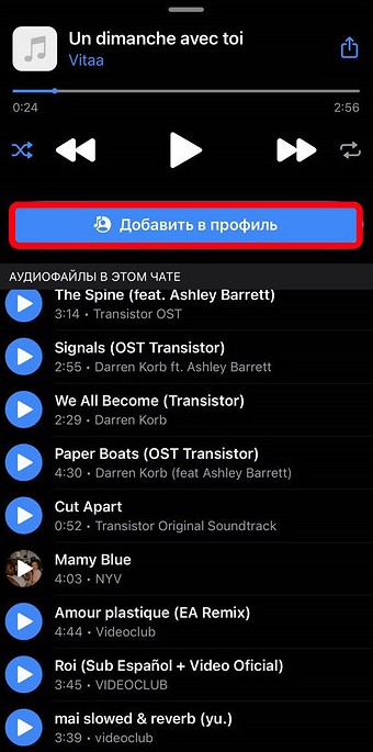 - Кнопка «Добавить в профиль» буквально бросается в глаза. Нажав по ней, песня добавится на вашу страницу.