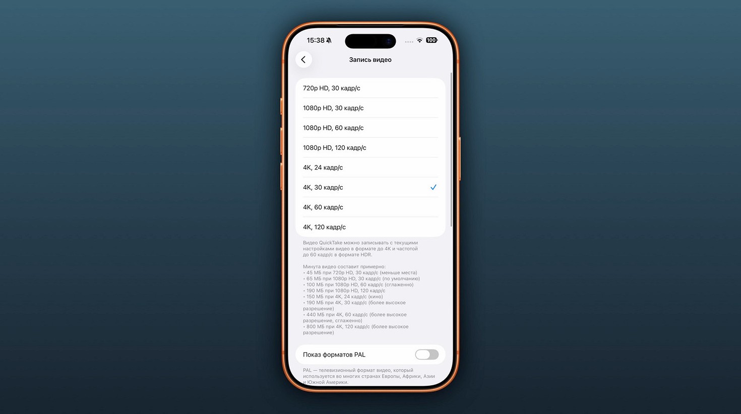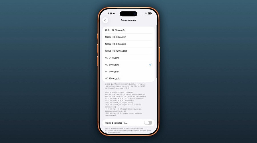 - Зайдите в «Запись видео» и выберите съёмку в 4K, 30 кадр/с для «киношного качества» роликов (60/120 кадров лучше включать для экшен-сцен);