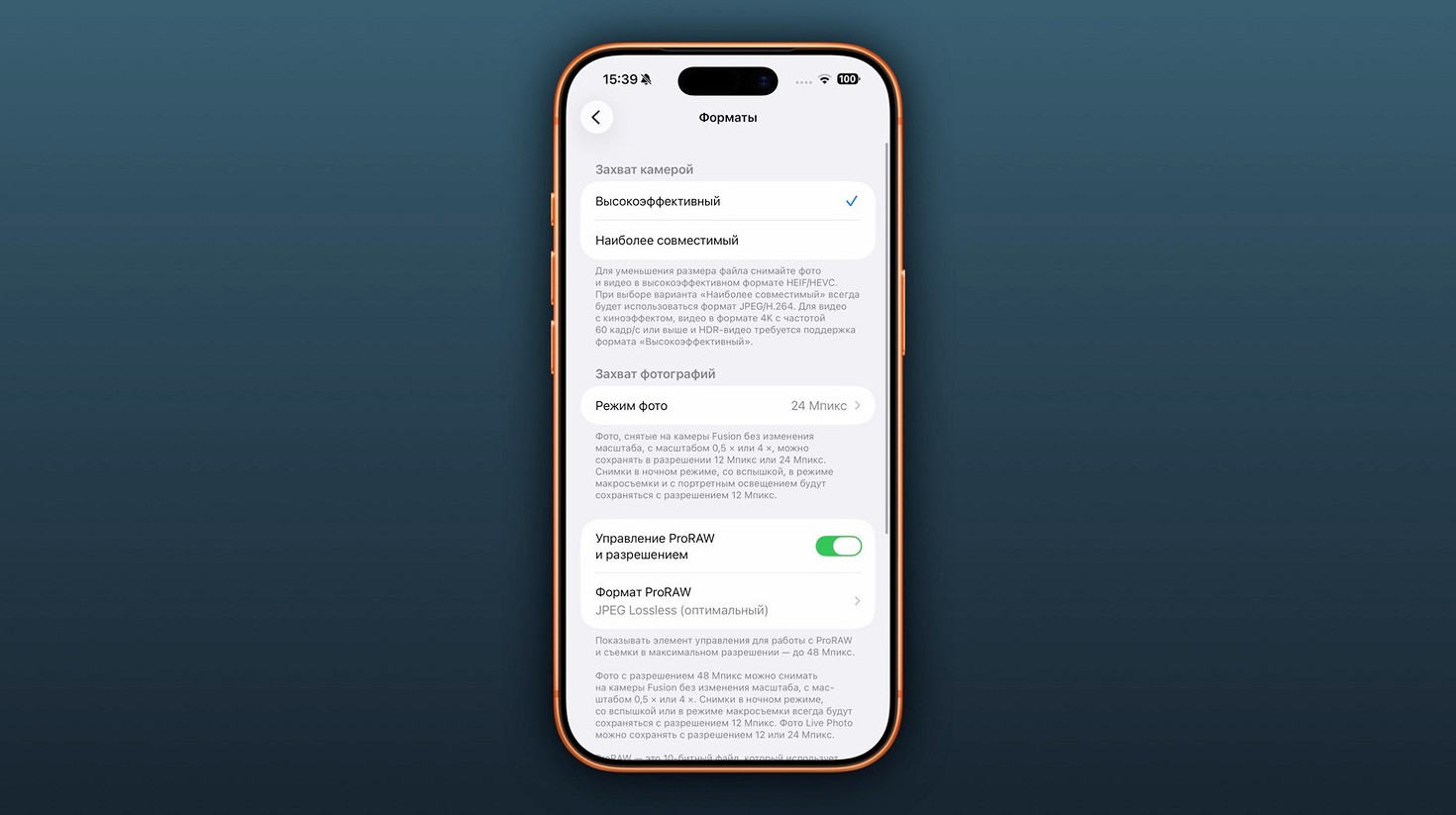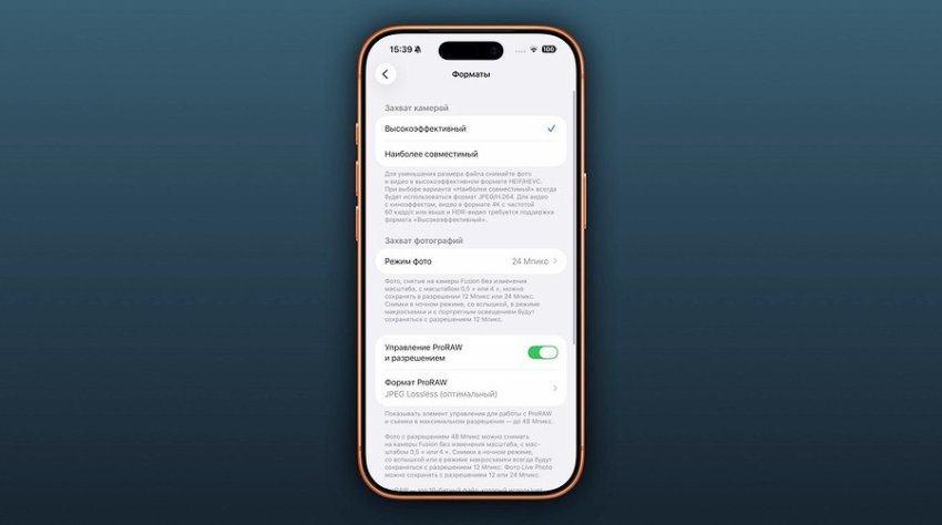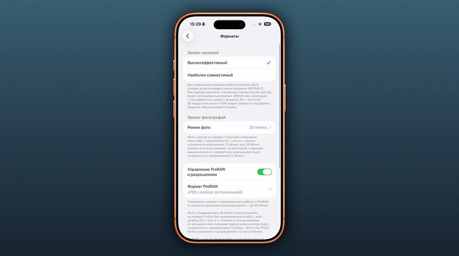 - Формат фото и видео — включите ProRAW для фото и ProRes для видео, если хотите максимальное качество и гибкость обработки, но обрабатывать придётся на компьютере или в сторонних приложениях.