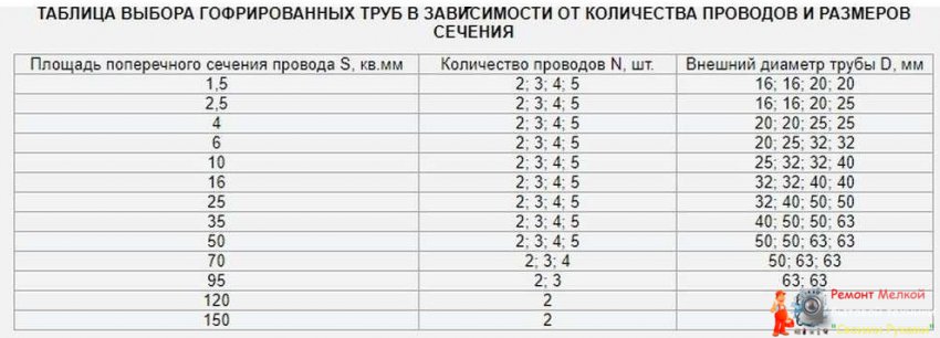 Таблица выбора диаметра гофры для кабеля и проводов в зависимости от сечения и количества проводов