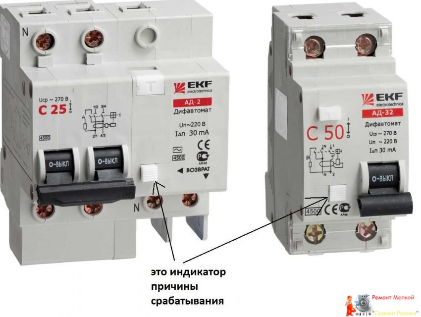 Чтобы решить хотя бы вторую проблему, производители стали делать флажки, которые показывают причину сработки дифавтомата. В некоторых моделях это небольшая площадка, по положению которой определяется причина отключения.