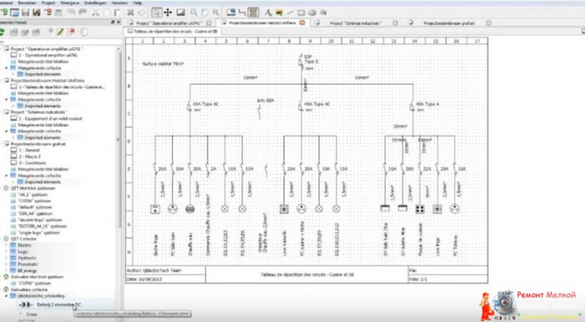 Программа для рисования схем QElectroTech есть на русском языке, причем русифицирована она полностью — меню, пояснения — на русском языке. Удобный и понятный интерфейс — иерархическое меню с возможными элементами и операциями в левой части экрана и несколько вкладок вверху. Есть также кнопки быстрого доступа для выполнения стандартных операций — сохранения, вывода на печать и т.п.