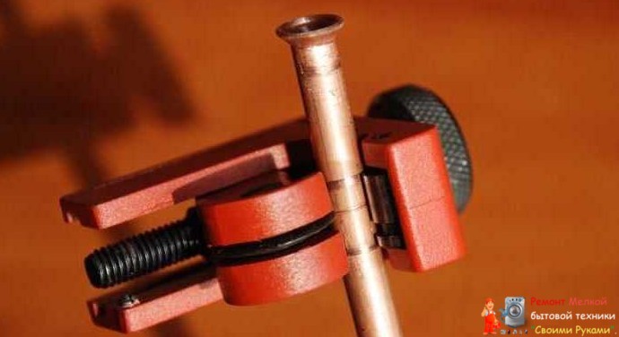При развальцовке трубу держите отверстием вниз. Опять-таки чтобы частицы меди не попали внутрь, а высыпались на пол. В держателе ее зажимают так, чтобы торчало 2 мм наружу. Именно так, ни больше, ни меньше. Зажимаем трубку, ставим конус развальцовки, закручиваем, прилагая солидные усилия (трубка толстостенная). Развальцовка закончена, когда конус дальше не идет. Повторяем операцию с другой стороны, потом с другой трубкой.