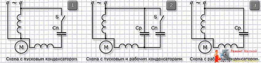 При подключении однофазного конденсаторного двигателя есть варианты: есть три схемы подключения и все с конденсаторами. Без них мотор гудит, но не запускается (если подключить его по схеме, описанной выше).