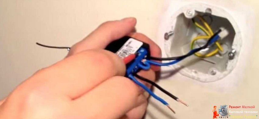Следующий шаг — подключение регулятора к проводке. Фазный провод устанавливаем на разъем с буквой L, нулевой — на N. Подключенное устройство заправляем в монтажную коробку (провода подгибаем).