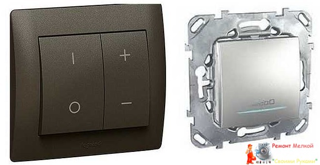 - Клавишные. По внешнему виду очень похожи на обычные выключатели. Включение/выключение света стандартное — перебросом клавиши, а регулировка начинается после удержания клавиши в нажатом состоянии более 3 секунд. есть модели в которых включение-отключение происходит одной клавишей, а регулировка другой.