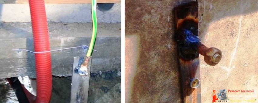 На входе в дом к металлической полосе от заземлителя приваривают болт, к которому крепится медный проводник в изоляции (традиционно окраска заземляющих проводов — желтая с зеленой полосой) сечением жилы не менее 4 мм2.