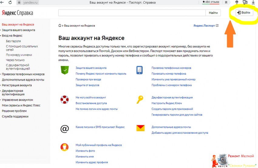 - Открыть главную страницу Яндекса через приложение браузера и кликнуть «Войти» в верхнем углу слева.