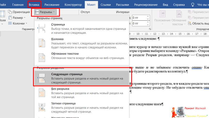 - В конце каждой страницы, которая заканчивает раздел, вставляем разрыв. Для этого устанавливаем курсор в нужном месте. Затем на вкладке «Макет» выбираем соответствующие пункты. Разрыв должен быть для «следующей страницы».