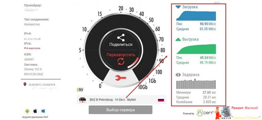 Жмем на кнопку «Начать тестирование» и ожидаем результат.- По окончании теста вы увидите справа средние значения скорости как на вход, так и на выход.