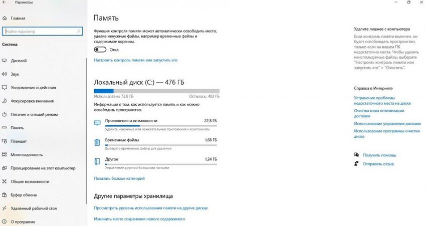 - Включите функцию контроля памяти операционной системы, переведя ползунок в положение «Вкл».