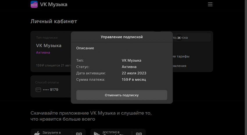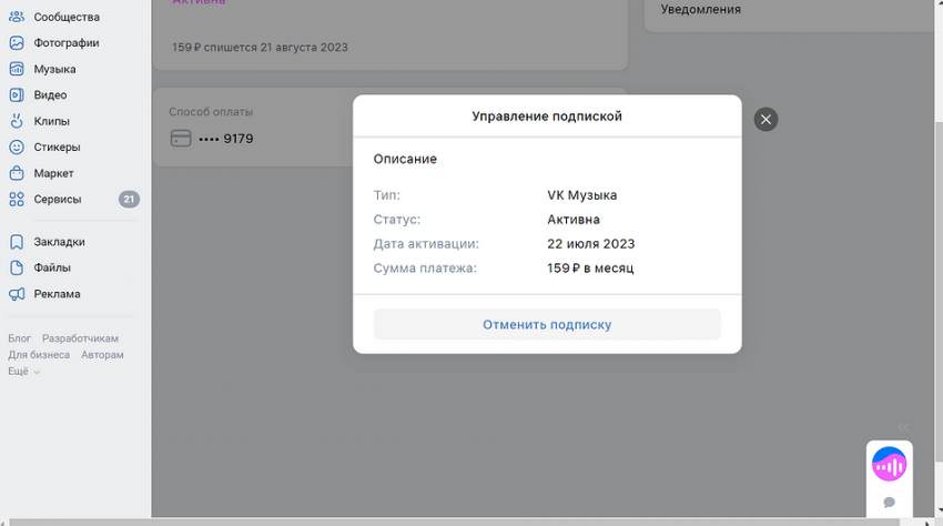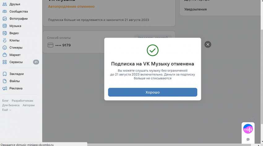 После отмены появится уведомление с зеленой галочкой: «Подписка на VK Музыку отменена».
