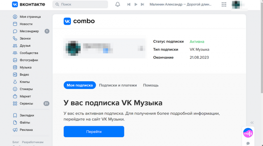 - В меню слева выберите «Подписки». Вы попадете на вкладку управления подпиской. На ней видно, активен ли пакет VK Combo — в него и входит ВК Музыка. Можно сразу перейти на эту страницу по ссылке https://vk.com/vk_music.