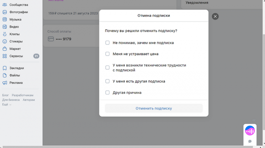 Кстати, во время отмены подписки ВК спросит, почему вы хотите это сделать, и предложит отметить галочкой подходящий вариант.