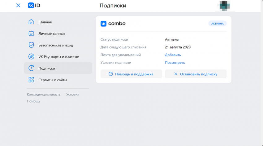 Так как подписка на Музыку входит в пакет ВК Комбо, то отменить ее можно через мини-приложение сервиса в соцсети ВК.