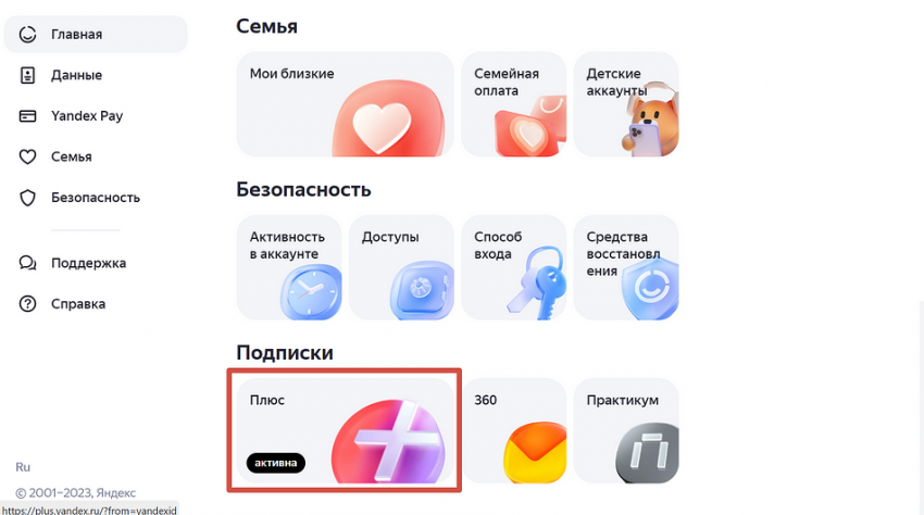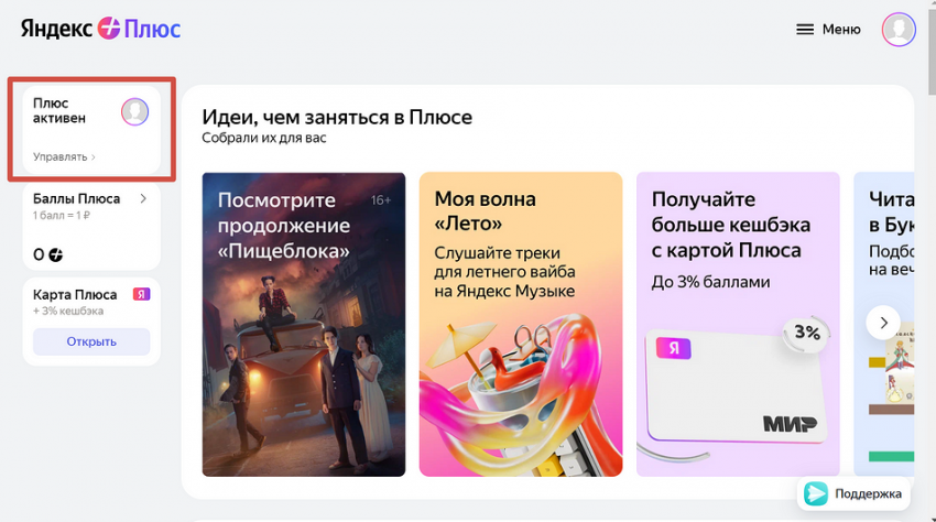 - Вы перейдете на страницу Яндекс Плюс. Можете также открыть ее через меню Яндекс ID или напрямую по ссылке: https://plus.yandex.ru/my.