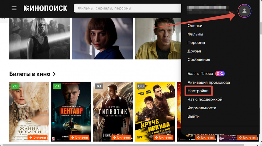 - Если вы находитесь на сайте Кинопоиск HD, то кликните на свой аватар в правом верхнем углу и выберите пункт «Настройки».