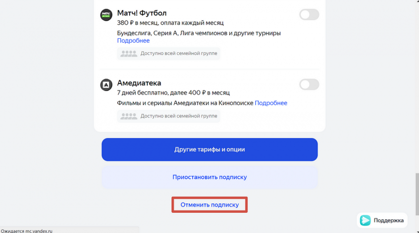 Если вы оплачивали подписку не через Яндекс, то в вашем аккаунте (Яндекс ID) не будет кнопки для отмены. Ищите кнопку «Отменить» на сайте сервиса, через который купили подписку.