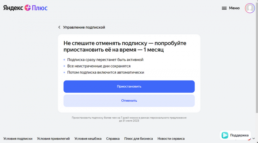 - Яндекс предложит не отказываться от Плюса, а приостановить подписку на месяц. Все оплаченные дни останутся, просто отсчет начнется через месяц. Это удобная функция, если вы не планируете пользоваться Кинопоиском какое-то время. Потом подписка включится автоматически.