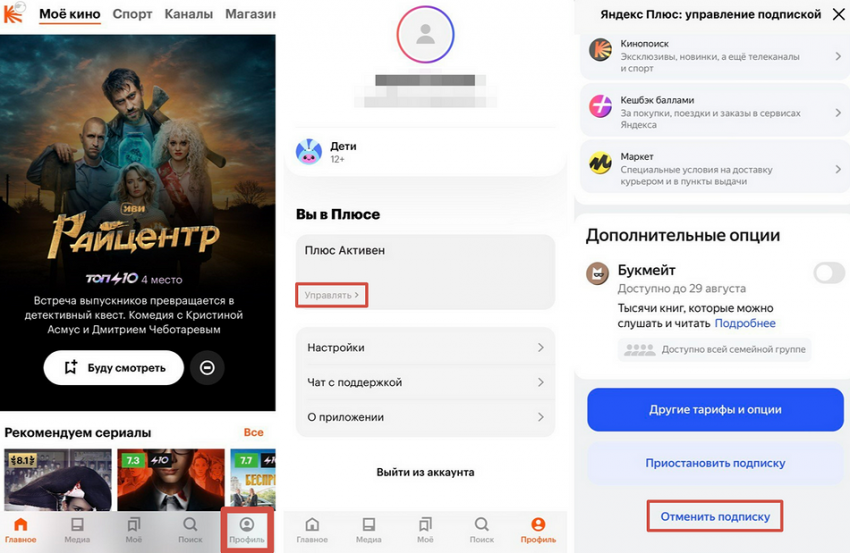 Отключить подписку на Кинопоиск от Яндекса можно через то приложение, в котором вы ее оплачивали. Это не всегда приложение самого Яндекса, ведь Плюс покупают через Google Play и платформы операторов: МТС, билайн, МегаФон, Tele2, Yota, Тинькофф Мобайл и Дом.ру. В таком случае вам необходимо зайти в свой личный кабинет на одном из этих сайтов и найти раздел с подписками, чтобы отменить Плюс.
