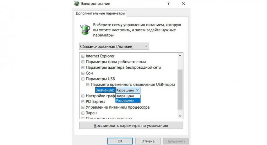 - Найдите в открывшемся окне пункт Параметры USB -> Параметры временного отключения USB-порта и измените его значение на «Запрещено».