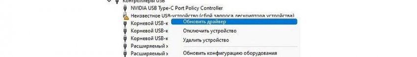 - в открывшемся окне найдите пункт «Контроллеры USB» и нажмите правой кнопкой мыши по неизвестному USB-устройству;