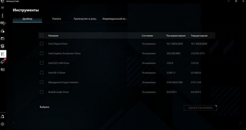 Многие производители имеют собственные фирменные утилиты, которые следят за актуальностью драйверов для установленного в ПК оборудования. К примеру, у той же Asus есть отличная утилита Armoury Crate. Просто перейдите на вкладку Инструменты -> Драйвер, и вы сможете обновить все нужные драйверы или убедиться в их актуальности.
