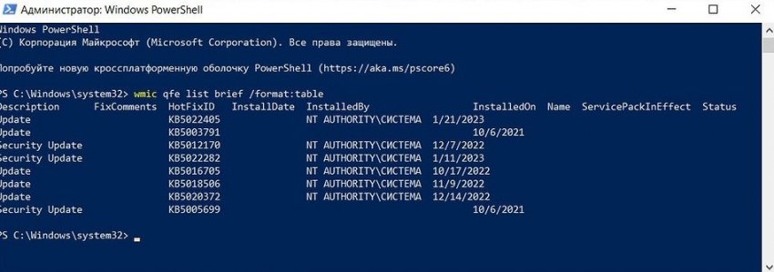 - Введите команду wmic qfe list brief /format:table. Она выведет список установленных обновлений, где можно найди дату апдейта и его номер.