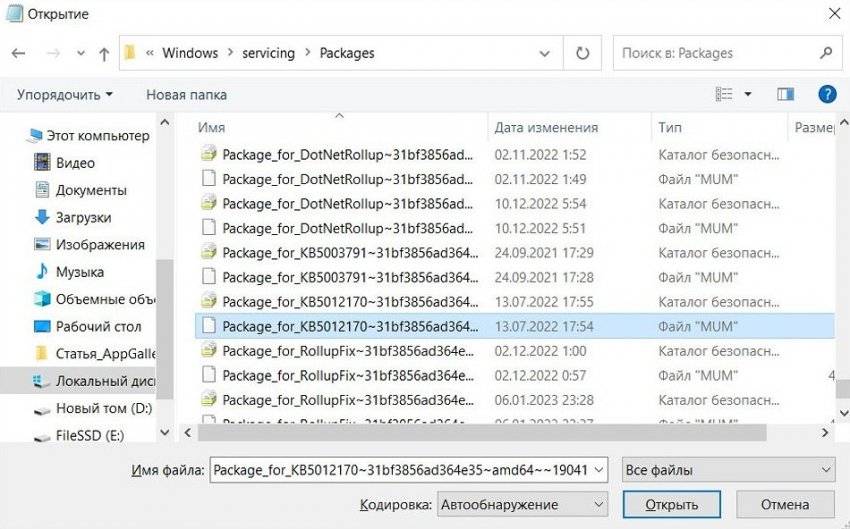 - Найдите в открывшемся перед вами большом списке файлы с названием, начинающимся на «Package_for_KB» (без кавычек), и обратите внимание на те из них, которые содержат номер проблемного обновления. Их будет два, выберите файл с расширением MUM.