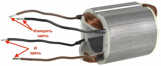Как проверить статор болгарки. Статор — это неподвижная часть двигателя, которая создает магнитное поле вокруг якоря и заставляет его вращаться. У статора тоже есть медная обмотка, которая может повредиться из-за перегрева или заклинивания двигателя. Проверяется аналогичным образом с помощью мультиметра. Здесь достаточно прозвонить все имеющиеся пары и сравнить показатели — они не должны отличаться более чем на 0,1 Ом. Если омметр показывает бесконечность, в обмотке, скорее всего, обрыв.