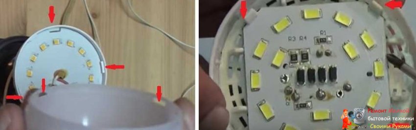 Есть два варианта. Более простой при разборке и более сложный. В простом детали лампы соединены только за счет механических защелок. В более сложном кроме защелок есть еще и силикон, который обеспечивает водонепроницаемость лампы. Такие экземпляры можно эксплуатировать при повышенной влажности. Разбирать светодиодную лампу нужно так: